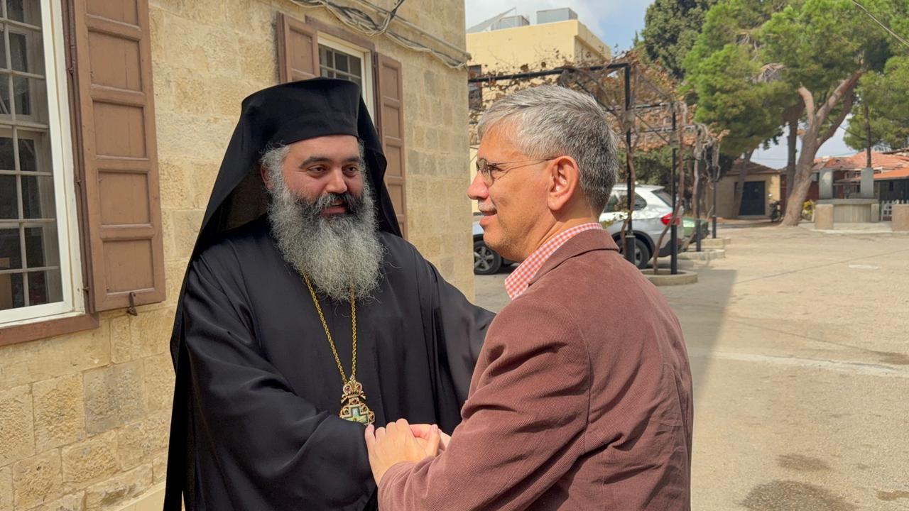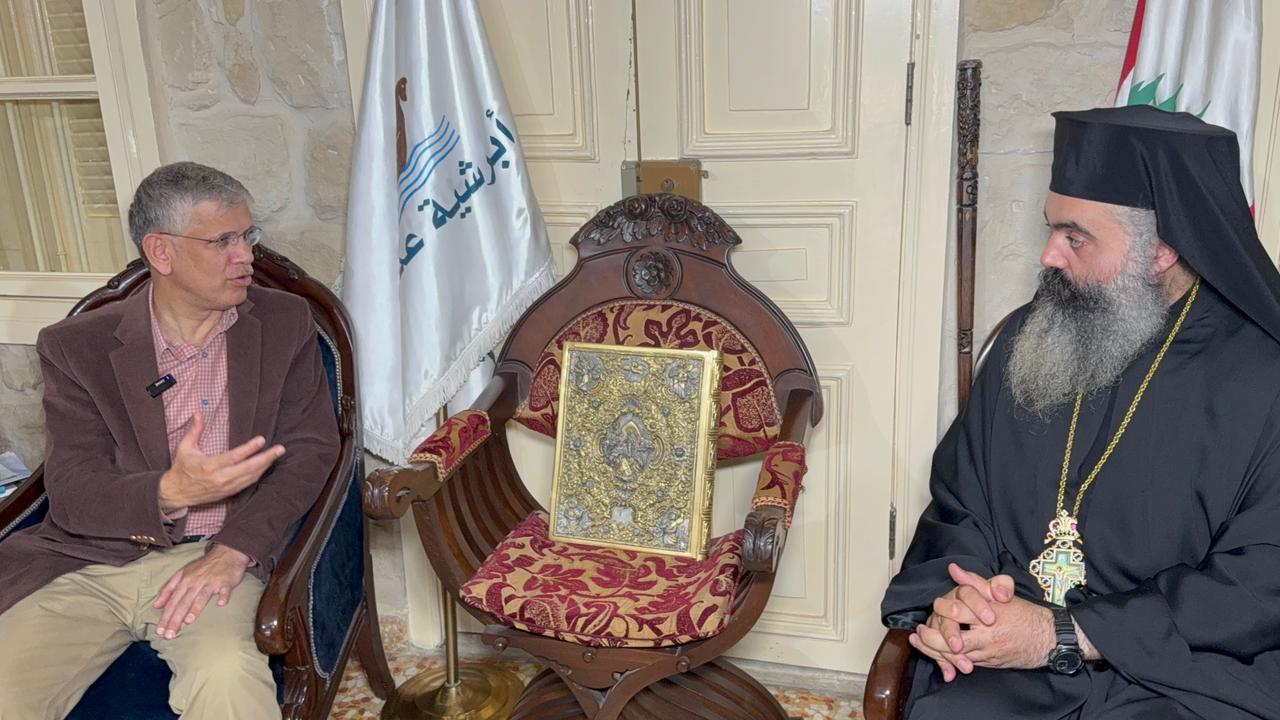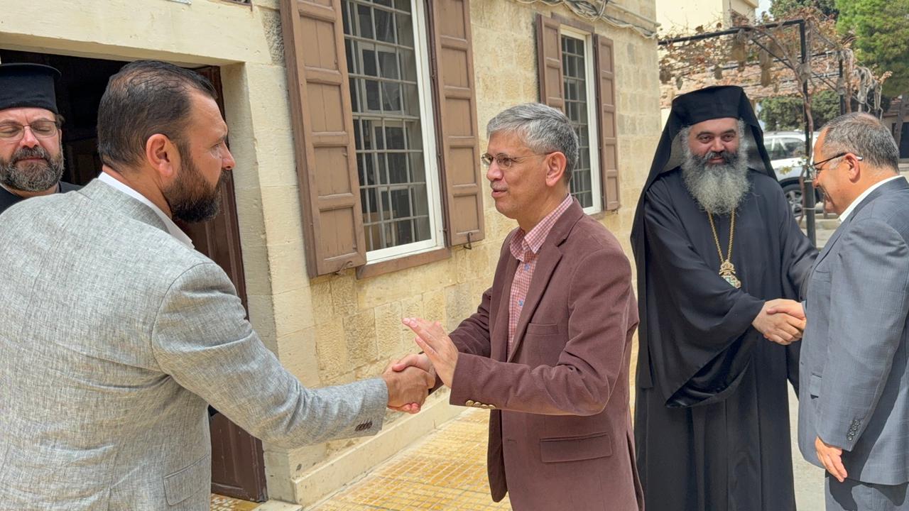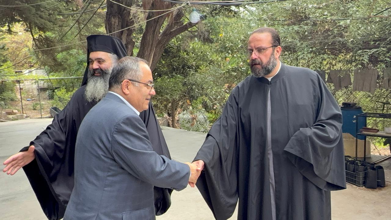 At the Archdiocese of Akkar and its Dependencies for the Greek Orthodox, Ambassador Athar was received by Archimandrite Yohana Al Mashreqi, representing Metropolitan Basilios Mansour, along with several priests. Archimandrite Al Mashreqi welcomed the guest and discussed with him the affairs of the region and coexistence among all its communities. He said: “One of the advantages of our archdiocese is that it extends across both Lebanese and Syrian regions. In Lebanon as in Syria, we face challenges that we must address. But we live in harmony with everyone. The Greek Orthodox community coexists with all others, whether in Lebanon or Syria. And while we are centered in Halba, which is our main hub, we are also present in many other areas.”